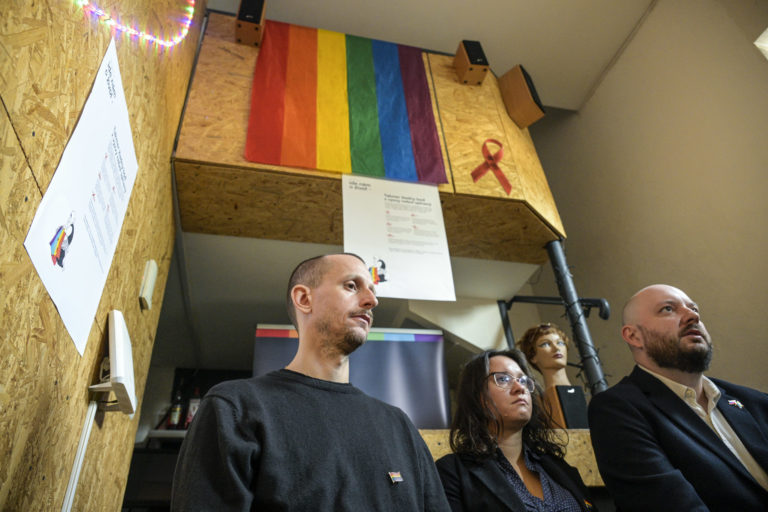 Zľava: Hovorca iniciatívy Ide nám o život Roman Samotný, Radka Trokšiarová, ktorá prežila útok na Tepláreň a riaditeľ iniciatívy Inakosť Martin Macko počas tlačového brífingu s názvom Rok po útoku na Tepláreň pri príležitosti prvého výročia od útoku na Zámockej ulici v Bratislave, pri ktorom zomreli dvaja mladí ľudia. Bratislava, 12. október 2023. Foto: SITA/Milan Illík.