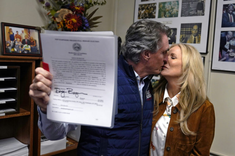 Guvernér Severnej Dakoty Doug Burgum s manželkou po tom, čo ohlásil kandidatúru do republikánskych primárnych volieb. Foto: SITA/AP.