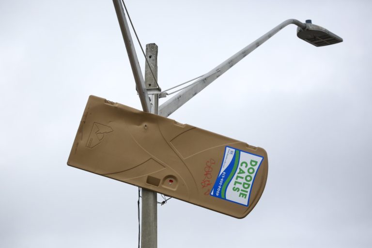 Dvere prenosného WC na stĺpe verejného osvetlenia po búrka, ktorá sa prehnala Floridou. Foto: Douglas R. Clifford/Tampa Bay Times via AP.