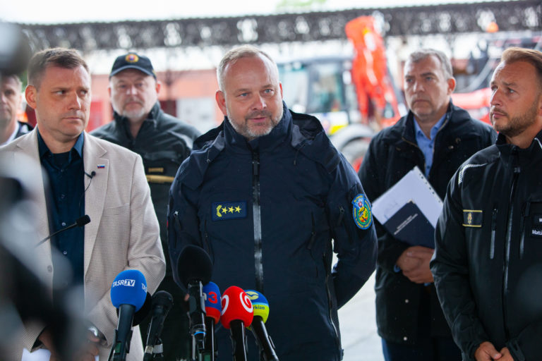 V popredí zľava: Podpredseda vlády SR a minister životného prostredia Tomáš Taraba a generálny riaditeľ sekcie krízového riadenia Ministerstva vnútra SR Ervin Erdélyi počas tlačovej konferencie v priestoroch Záchrannej brigády Hasičského a záchranného zboru v Malackách po zasadnutí krízového štábu v súvislosti s očakávanou zvýšenou zrážkovou činnosťou. Malacky, 12. september 2024. Foto: SITA/Bokor Tomáš