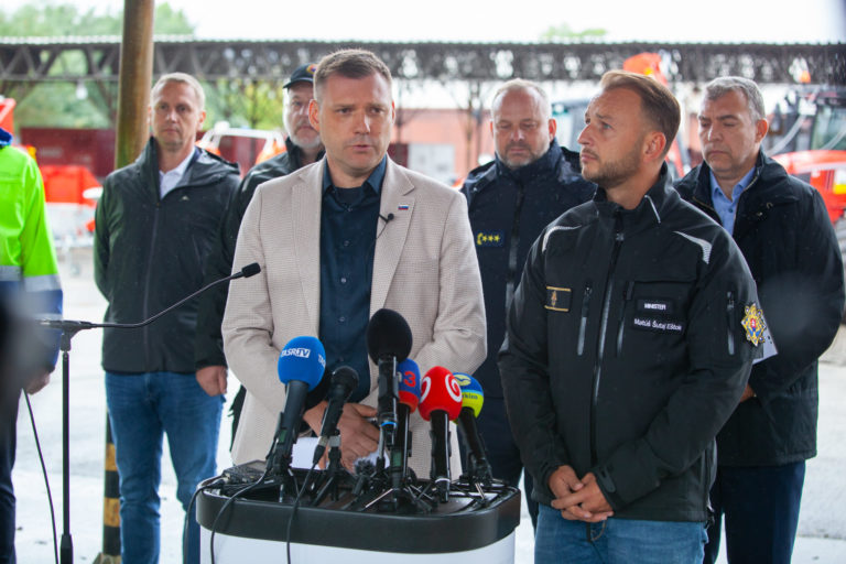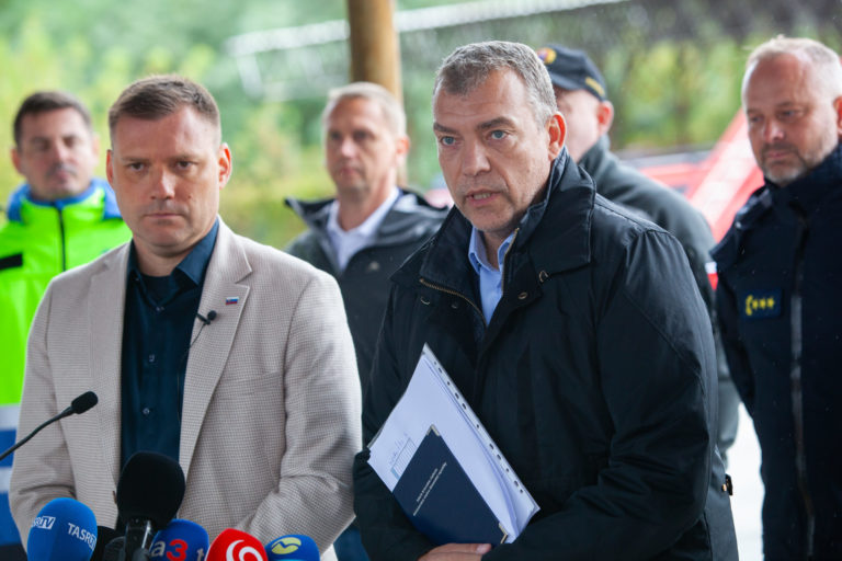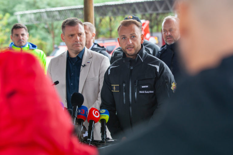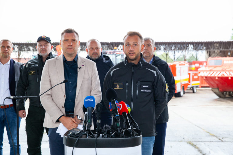 V popredí zľava: Podpredseda vlády SR a minister životného prostredia Tomáš Taraba a minister vnútra SR Matúš Šutaj Eštok počas tlačovej konferencie v priestoroch Záchrannej brigády Hasičského a záchranného zboru v Malackách po zasadnutí krízového štábu v súvislosti s očakávanou zvýšenou zrážkovou činnosťou. Malacky, 12. september 2024. Foto: SITA/Bokor Tomáš