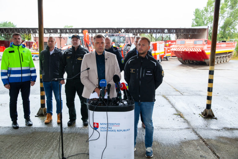 V popredí zľava: Podpredseda vlády SR a minister životného prostredia Tomáš Taraba, prezident Hasičského a záchranného zboru Adrián Mifkovič a minister vnútra SR Matúš Šutaj Eštok počas tlačovej konferencie v priestoroch Záchrannej brigády Hasičského a záchranného zboru v Malackách po zasadnutí krízového štábu v súvislosti s očakávanou zvýšenou zrážkovou činnosťou. Malacky, 12. september 2024. Foto: SITA/Bokor Tomáš