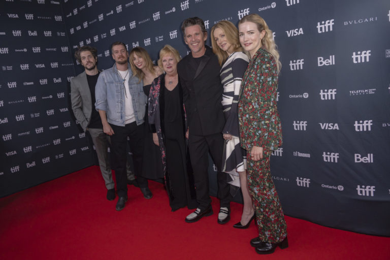 Zľava: Philip Ettinger, Rafael Casal, Maya Hawke, Christine Dye, Ethan Hawke, Laura Linney a Willa Fitzgerald na premiére filmu "Wildcat" počas Medzinárodného filmového festivalu v Toronte. Foto: SITA/Photo by Joel C Ryan/Invision/AP