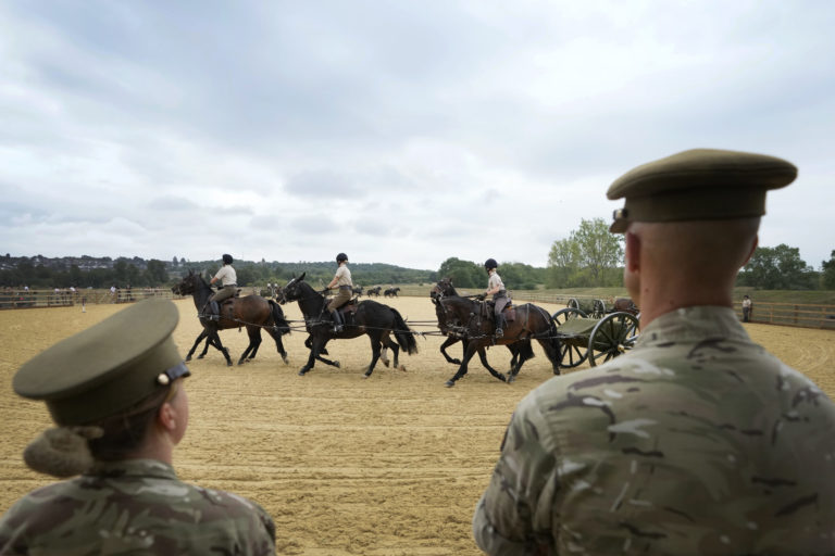 Slávnostná jednotka britskej armády Kings Troop Royal Horse Artillery nacvičuje na vystúpenie, ktoré bude mať na medzinárodnej výstave koňov v Londýne. Foto: SITA/AP