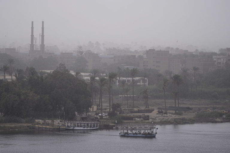 Loď pláva po Níle počas prachovej búrky, ktorá zasiahla Káhiru. Foto: SITA/AP