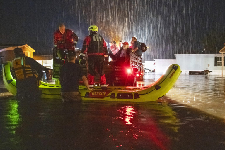 Hasiči evakuujú ľudí z Leominsteru v štáte Massachusetts, po tom, čo mesto zasiahli záplavy. Foto: SITA/Worcester Telegram & Gazette via AP