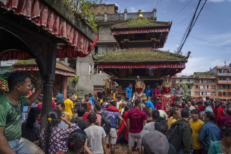 Veriaci pri soche Budhu počas festivalu Pancha Dan v Bhaktapure v Nepále. Foto: SITA/AP