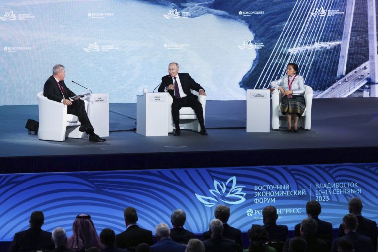 Ruský prezident Vladimir Putin diskutuje na Východnom ekonomickom fóre v ruskom Vladivostoku. Foto: Sergey Shinov, Roscongress Foundation via AP