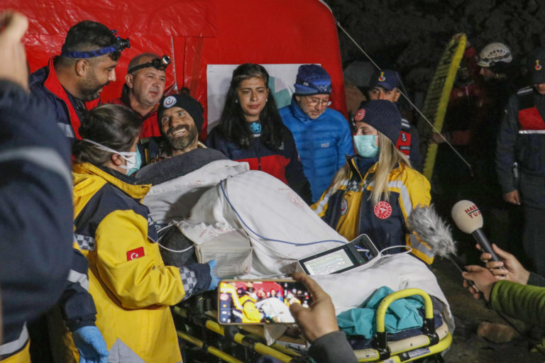 Medzinárodnému tímu záchranárov sa podarilo dostať do bezpečia amerického výskumníka Marka Dickeyho, ktorý v dôsledku krvácania do žalúdka na deväť dní uviazol v jaskyni na juhu Turecka. Foto: SITA/Suleyman Cenk Idaye/IHA via AP