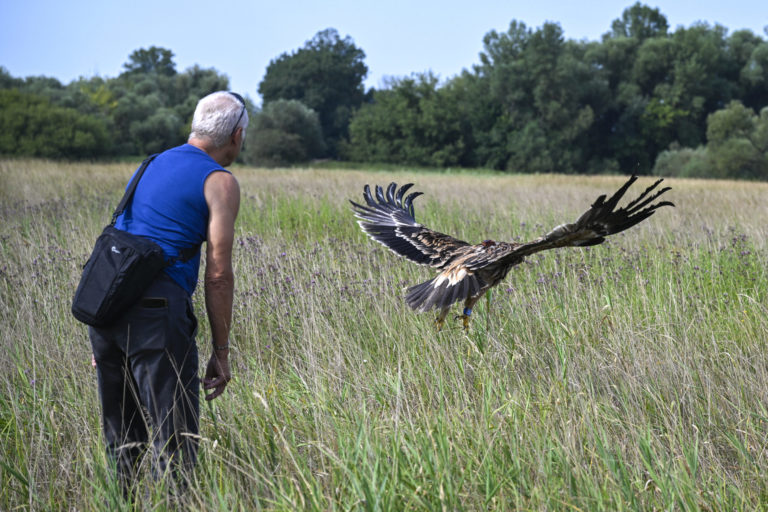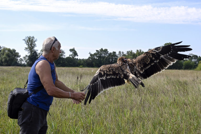 Predseda organizácie Ochrany dravcov na Slovensku Jozef Chavko počas vypustenia orla kráľovského (lat. Aquila heliaca) pri Devínskom jazere pri Stupave, ktorého sa podarilo zachrániť za pomoci Záchrannej stanice pre voľne žijúce živočíchy Brezová pod Bradlom, Slovenskej ornitologickej spoločnosti a Štátnej ochrany prírody pred otravou rodenticídami. Bratislava, 13. august 2024. Foto: SITA/Milan Illík