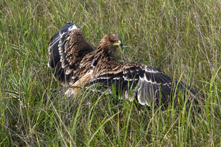 Vypustenie orla kráľovského (lat. Aquila heliaca) pri Devínskom jazere pri Stupave, ktorého sa podarilo zachrániť za pomoci Záchrannej stanice pre voľne žijúce živočíchy Brezová pod Bradlom, Slovenskej ornitologickej spoločnosti a Štátnej ochrany prírody pred otravou rodenticídami. Bratislava, 13. august 2024. Foto: SITA/Milan Illík