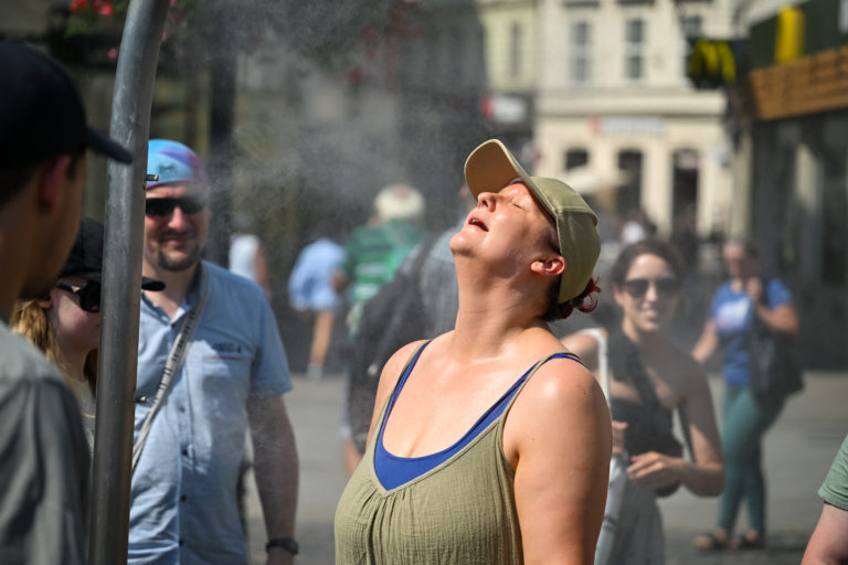 Žena sa osviežuje pod vodnou hmlou na Hviezdoslavovom námestí počas tropických teplôt v Bratislave. Bratislava, 13. august 2024. Foto: SITA