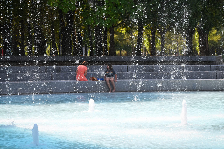 Ľudia sa osviežujú vo fontáne v parku Andreja Hlinku počas tropických teplôt v Bratislave. Bratislava, 13. august 2024. Foto: SITA
