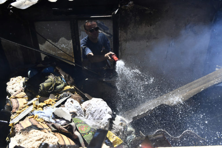 Požiarnik v utorok 13. augusta 2024 hasí vodou oheň na predmestí Nea Penteli v Aténach po veľkom lesnom požiari, ktorý zachvátil severné predmestie gréckej metropoly. Foto: SITA/AP