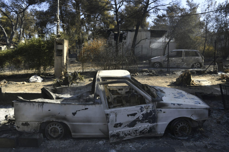Spálené autá parkujú pred poškodeným domom v Chalandri na predmestí Atén v utorok 13. augusta 2024 po veľkom lesnom požiari, ktorý zachvátil severné predmestie gréckej metropoly a vyvolal viaceré evakuácie. Foto: SITA/AP