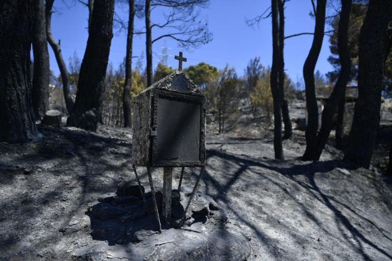 Spálená svätyňa pri ceste na predmestí Nea Penteli v Aténach v utorok 13. augusta 2024 po veľkom lesnom požiari, ktorý zasiahol severné predmestie gréckeho hlavného mesta. Foto: SITA/AP