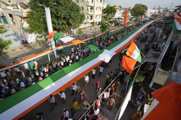 Ľudia nesú obrovskú indickú vlajku počas pochodu počas Dňa nezávislosti v Ahmedabad, India, utorok 13. augusta 2024. Foto: SITA/AP