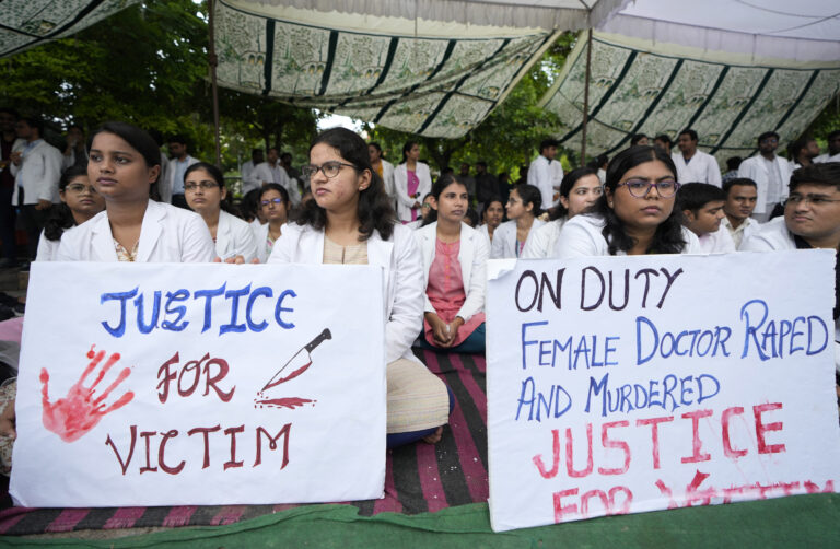 Lekári vo vládnej nemocnici Swaroop Rani Nehru protestujú proti znásilneniu a vražde zdravotníka v Kalkate minulý týždeň, držia transparenty v Prayagraj, Uttar Pradesh, India, utorok 13. augusta 2024. Foto:SITA/AP