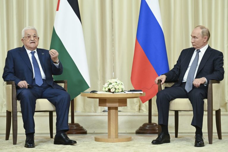 Palestínsky prezident Mahmúd Abbás (vľavo) sa rozpráva s ruským prezidentom Vladimirom Putinom (vpravo) počas ich stretnutia v štátnej rezidencii Novo-Ogaryovo pri Moskve v Rusku, utorok 13. augusta 2024. Foto: Alexey Maishev, Sputnik, Kremlin Pool Photo via AP)