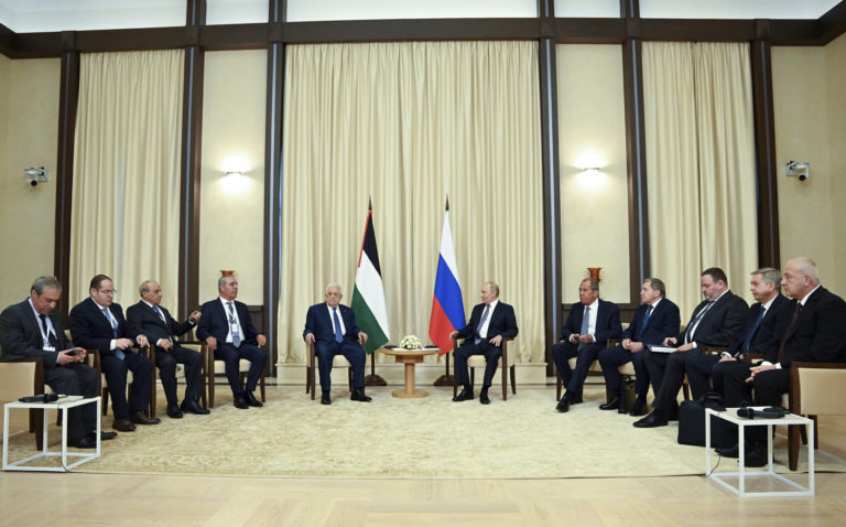 Palestínsky prezident Mahmúd Abbás (v strede vľavo) a ruský prezident Vladimir Putin hovoria počas stretnutia v štátnej rezidencii Novo-Ogaryovo pri Moskve v Rusku, utorok 13. augusta 2024. Foto: Alexey Maishev, Sputnik, Kremlin Pool Photo via AP