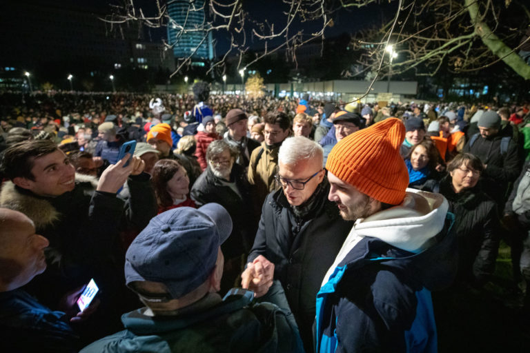 Kandidát na prezidenta SR Ivan Korčok (uprostred) počas protestného zhromaždenia opozičných strán PS, SaS a KDH pred Úradom vlády SR. Bratislava, 12. december 2023. Foto: SITA/Diana Černak.