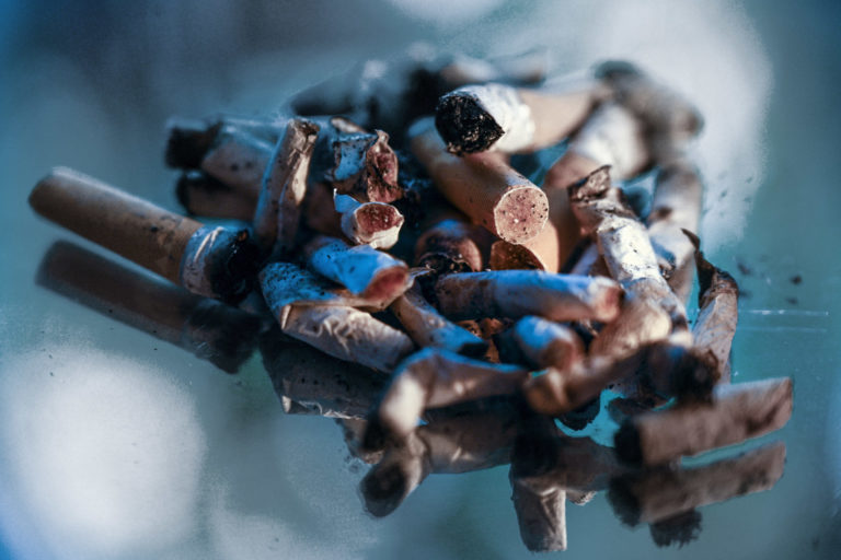 Ohorky z cigariet po fajčení tabaku, ktorý obsahuje vysoko navýkovú legálnu drogu nikotín. Bratislava, 13. december 2023. Foto: SITA/Milan Illík.