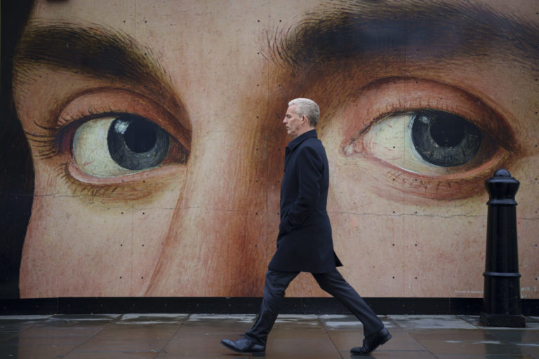 Muž prechádza okolo plagátu s obrazom talianskeho umelca Antonella da Messinu pred Národnou galériou na londýnskom Trafalgar Square. Foto: SITA/AP.