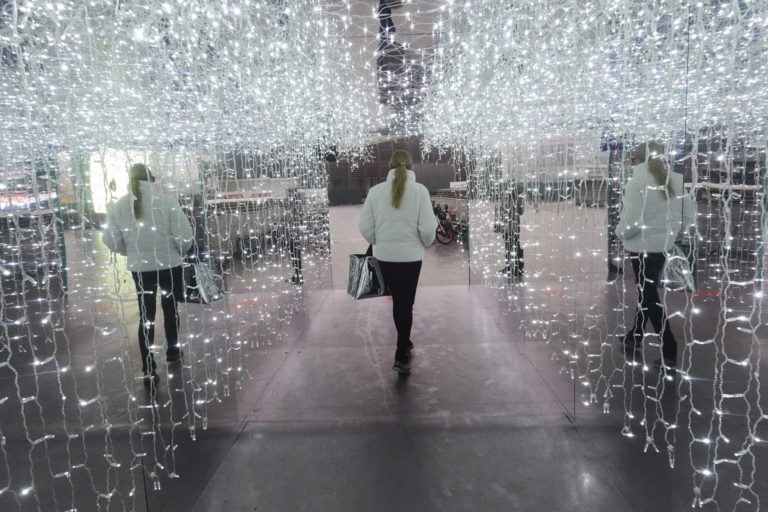 Žena prechádza cez vianočnú inštaláciu v talianskom Miláne. Foto: SITA/AP.
