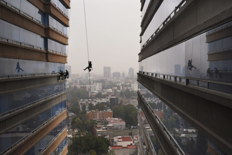 Umývači okien čistia budovu v Mexico City. Foto: SITA/AP.