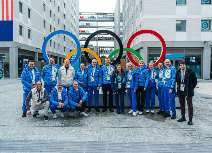 Prezident SR Peter Pellegrini (uprostred), prezident Slovenského zväzu ľadového hokeja (SZĽH) Miroslav Šatan (v pozadí, druhý zľava) a prezident Slovenského olympijského a športového výboru (SOŠV) Anton Siekel počas návštevy prezidenta SR v olympijskej dedine v talianskom Miláne, kde je ubytovaná najväčšia časť športovcov, trénerov a členov výprav na zimných olympijských hrách (ZOH) 2026. Miláno, Taliansko, 12. február 2026. Foto: SITA/Kancelária prezidenta SR