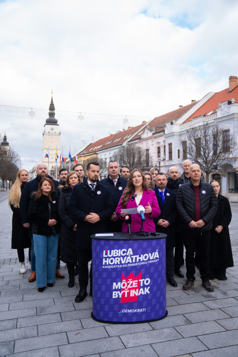 Zľava v popredí: Podpredseda Demokratov Juraj Šeliga a členka Demokratov Ľubica Horváthová počas tlačovej konferencie politickej strany Demokrati k ohláseniu kandidatúry Ľubice Horváthovej na post primátorky Trnavy. Trnava, 13. február 2026. Foto: SITA/Demokrati