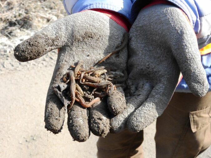 Jašterice počas stavania zábran na ochranu pri jarných migráciách obojživelníkov, ktoré vybudovali Záchranná stanica pre voľne žijúce živočíchy Brezová pod Bradlom, dobrovoľníci a zamestnanci CHKO Malé Karpaty na frekventovanej ceste z Hradišta pod Vrátnom do Brezovej pod Bradlom. Obojživelníky zachytené zábranami nebudú prechádzať cez vozovku, ostanú pri nej a ochranári ich následne pozbierajú a prenesú na druhú stranu do mokrade. Hradište, 13. február 2026. Foto: SITA/Správa CHKO Záhorie