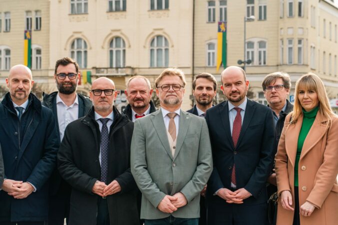 Primátor mesta Nitra Marek Hattas (druhý zľava), predseda SaS Branislav Gröhling (tretí zľava), predseda Maďarské fórum Zsolt Simon (štvrtý zľava), kandidát na primátora mesta Levice Vladimír Kuny (uprostred) a podpredseda Národnej rady SR za Progresívne Slovensko Martin Dubéci (tretí sprava) počas tlačovej konferencie k ohláseniu kandidatúry Vladimíra Kunyho na post primátora Levíc s podporou strán Progresívne Slovensko, Sloboda a Solidarita (SaS), Tím Kraj Nitra, Demokrati, Hnutie Slovensko a Maďarské fórum. Levice, 13. február 2026. Foto: SITA/Ladislav Kuny