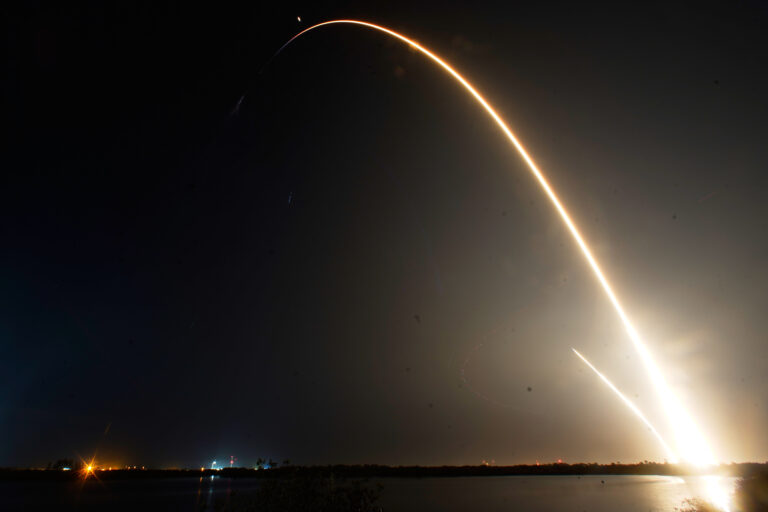 Raketa SpaceX Falcon 9 so štvorčlennou posádkou na palube vesmírnej lode Dragon počas časovej expozície pri štarte z rampy 40 na vesmírnej stanici Cape Canaveral Space Force Station v Cape Canaveral na Floride a nosná raketa (druhý pruh vľavo) pri pristávaní na štartovacej rampe. Florida, 13. februára 2026. Foto: AP Photo/John Raoux