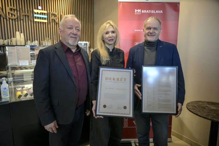 Zľava: Predseda predstavenstva Bratislava Tourist Board (BTB) Vladimír Grežo, zodpovedná vedúca cukrárne Asheri Yana Asheri a vydavateľ Gurmána na Slovensku Radoslav Nackin počas tlačovej konferencie Bratislava Tourist Board a klubu Gurmán v cukrárni Asheri v Bratislave, na ktorej predstavili víťazný dezert súťaže cukrárov o vytvorenie receptu na Bratislavský korunovačný dezert 2024. Bratislava, 13. marec 2024. Foto: SITA/Milan Illík