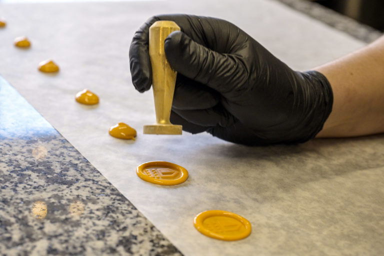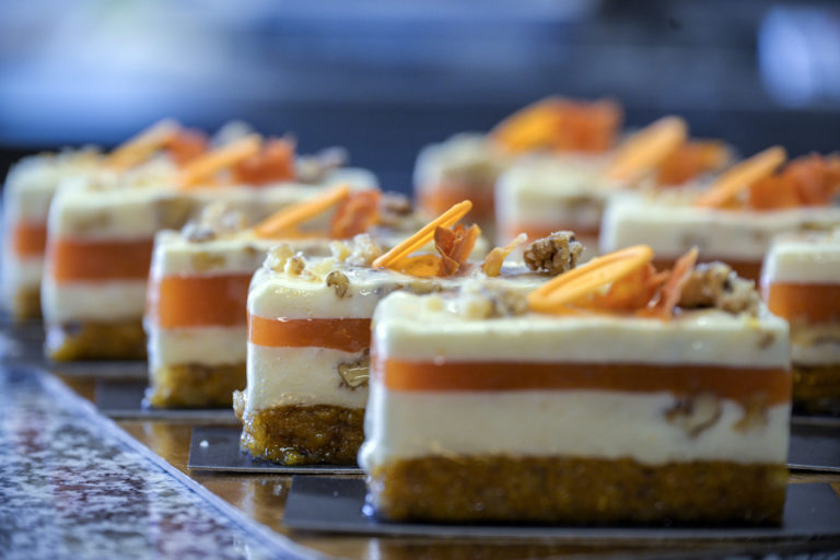 Víťazný dezert súťaže cukrárov o vytvorenie receptu na Bratislavský korunovačný dezert 2024, ktorý predstavili Bratislava Tourist Board s klubom Gurmán na tlačovej konferencii v bratislavskej cukrárni Asheri. Bratislava, 13. marec 2024. Foto: SITA/Milan Illík
