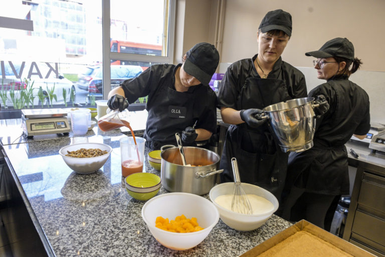Cukrári pripravujú víťazný dezert súťaže cukrárov o vytvorenie receptu na Bratislavský korunovačný dezert 2024, ktorý predstavili Bratislava Tourist Board s klubom Gurmán na tlačovej konferencii v bratislavskej cukrárni Asheri. Bratislava, 13. marec 2024. Foto: SITA/Milan Illík