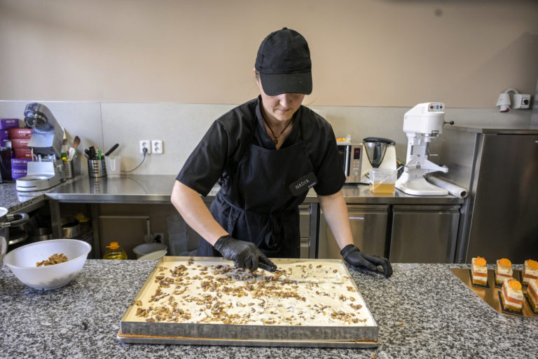 Cukrárka pripravuje víťazný dezert súťaže cukrárov o vytvorenie receptu na Bratislavský korunovačný dezert 2024, ktorý predstavili Bratislava Tourist Board s klubom Gurmán na tlačovej konferencii v bratislavskej cukrárni Asheri. Bratislava, 13. marec 2024. Foto: SITA/Milan Illík
