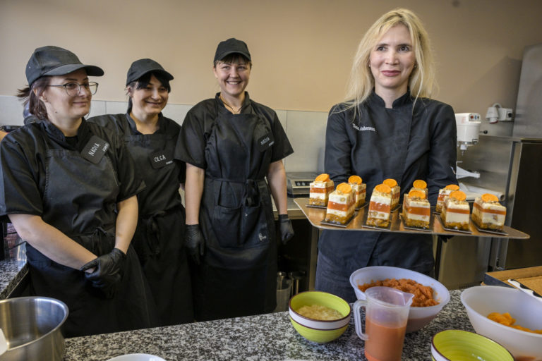 Zodpovedná vedúca cukrárne Asheri Yana Asheri (vpravo) počas tlačovej konferencie v cukrárni Asheri v Bratislave, na ktorej predstavila víťazný dezert súťaže cukrárov o vytvorenie receptu na Bratislavský korunovačný dezert 2024. Bratislava, 13. marec 2024. Foto: SITA/Milan Illík