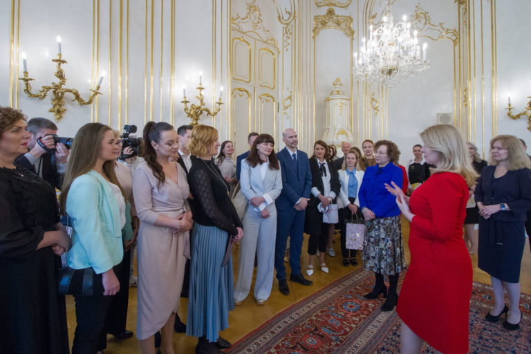 Prezidentka SR Zuzana Čaputová (druhá sprava) počas prijatia dobrovoľníkov Srdce na dlani v Prezidentskom paláci. Bratislava, 13. marec 2024. Foto: SITA/Ľudovít Vaniher.