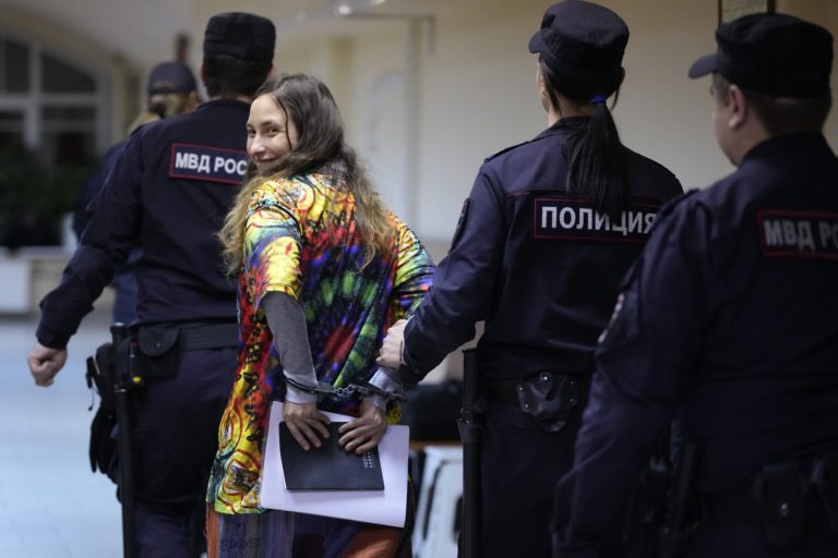 Saša Skočilenko, 33-ročný umelec a hudobník (druhý zľava) eskortovaný policajtmi zo súdnej siene na pojednávanie na Vasileostrovskom okresnom súde v ruskom Petrohrade. Foto: SITA/AP