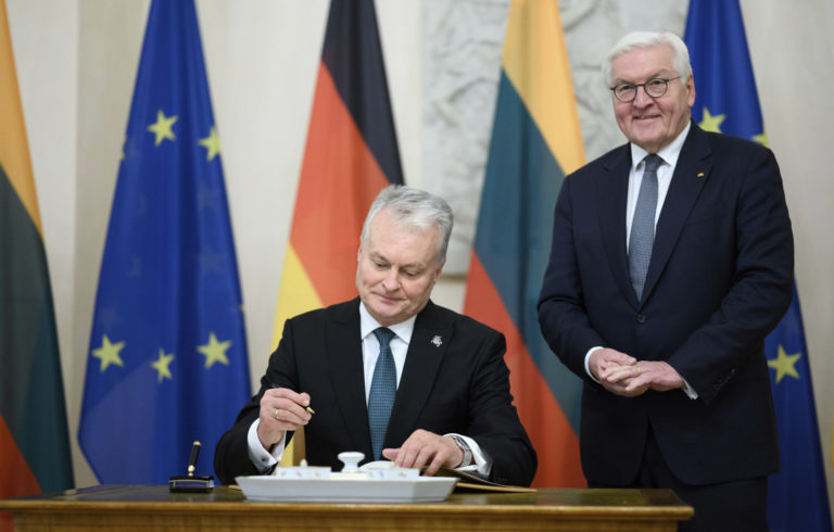 Litovský prezident Gitanas Nauseda (vľavo) sa podpisuje do knihy hostí pred stretnutím s nemeckým prezidentom Frankom-Walterom Steinmeierom (vpravo) v paláci Bellevue v Berlíne. Foto: archívne, Bernd von Jutrczenka/dpa via AP