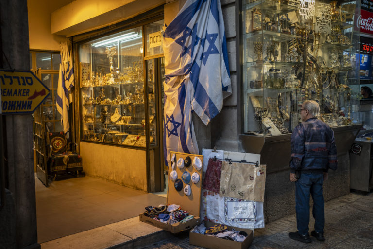 Židovské náboženské predmety vystavené vo výklade v Jeruzaleme. Foto: SITA/AP