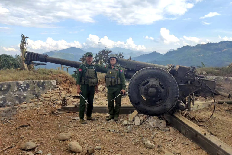 Členovia mjanmarskej armády Národnej demokratickej aliancie pred zabavenou húfnicou v meste Kunlong. Foto: The Kokang online media via AP