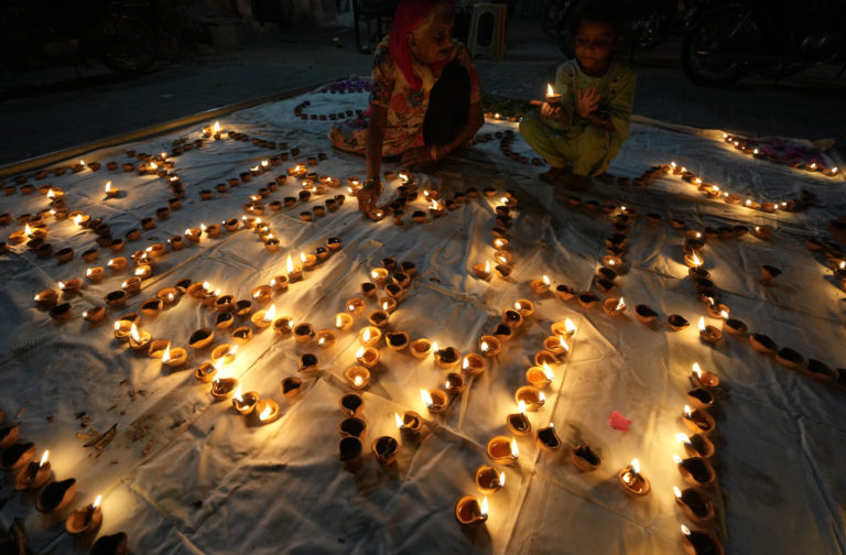 Hinduistická žena (vľavo) na obrade pri príležitosti osláv sviatku svetiel Diwali v chráme Somi Narin v pakistanskom Karáči. Foto: SITA/AP