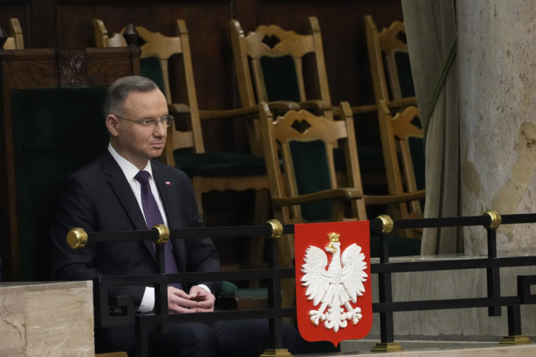 Poľský prezident Andrzej Duda na prvom zasadnutí dolnej komory novozvoleného parlamentu vo Varšave. Foto: SITA/AP