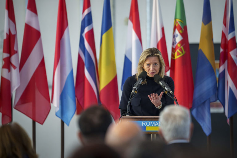 Holandská ministerka obrany Kajsa Ollongrenová počas slávnostného otvorenia výcvikového strediska pilotov stíhačiek F-16. Foto: SITA/AP