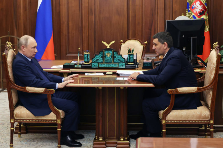 Ruský prezident Vladimir Putin (vľavo) a generálny riaditeľ, predseda predstavenstva spoločnosti PJSC Rosseti Andreja Rjumina počas ich stretnutia v Moskve. Foto: Gavriil Grigorov, Sputnik, Kremlin Pool Photo via AP