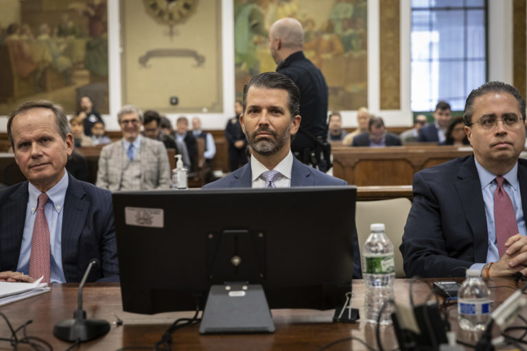 Donald Trump mladší sedí v súdnej sieni so svojím právnym tímom pred pokračovaním občianskoprávneho procesu o obchodnom podvode. Foto: Stefan Jeremiah/Pool Photo via AP