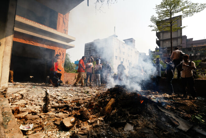 Tlejúci oheň po tom, čo bola poškodená kancelária strany Awami League vedená zosadenou premiérkou Šajch Hasinou počas celoštátneho „lockdownu“, ktorý strana vyhlásila na protest proti jej súdnemu procesu, v Dháke. Bangladéš, 13. novembra 2025. Foto: AP Photo/Mahmud Hossain Opu